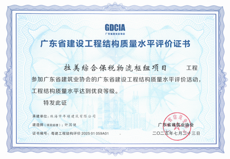 与此同时,广东省建筑业协会发布 2025 年第一批建设工程结构质量水平评价结果(粤建协〔2025〕76 号),由年顺建筑承建的综合保税物流枢纽项目,凭借过硬的工程品质脱颖而出,成功获评结构质量水平优良等级,成为珠海市金湾区首批获此殊荣的保税区重点项目。